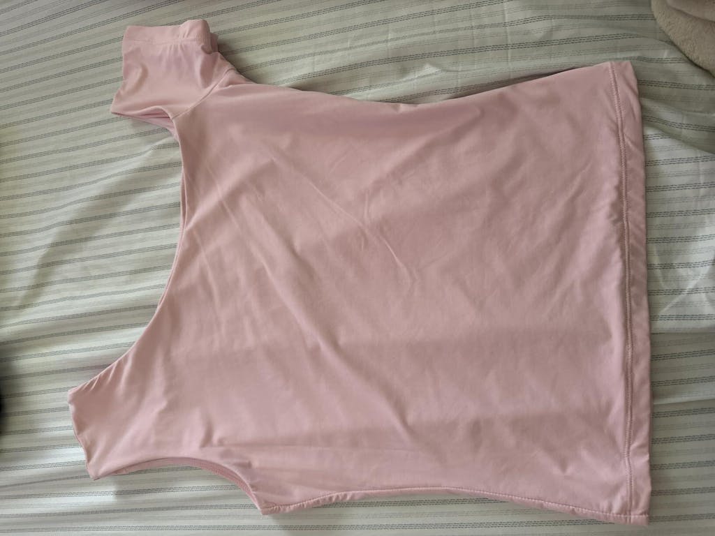 Este top con hombros descubiertos es muy sexy y el color rosa bebé es hermoso. Me gusta mucho el corte. Aunque me quedó un poco ajustado (talla M, peso 57 kg, busto 36C), el material elástico lo compensa. El diseño de los hombros al descubierto es muy favorecedor.