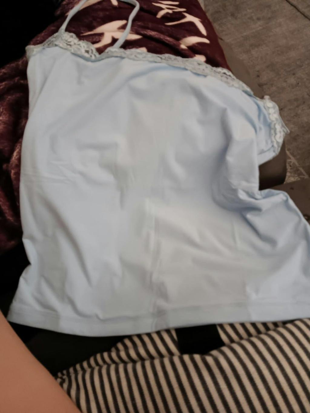 La tela es muy suave y los tirantes no se clavan en los hombros. El material se estira bien, aunque debería haber pedido una talla más porque se enrolla un poco al usarlo. Aun así, es muy bonito, especialmente el encaje de la parte superior.